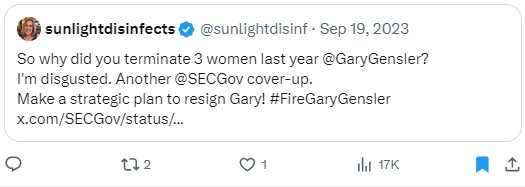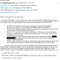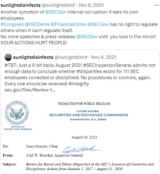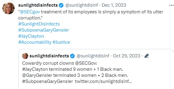 “As explained more fully in my Whistleblower statement, Willis, Coronel, and Bauguess have engaged in a number and variety of adverse, discriminatory actions against employees in the Division of Economic and Risk Analysis, especially those they could not control, who had years of experience, or asked questions. The corrupt trio’s hope – to silence institutional knowledge of the myriad of dysfunctional activities they perpetuate.”