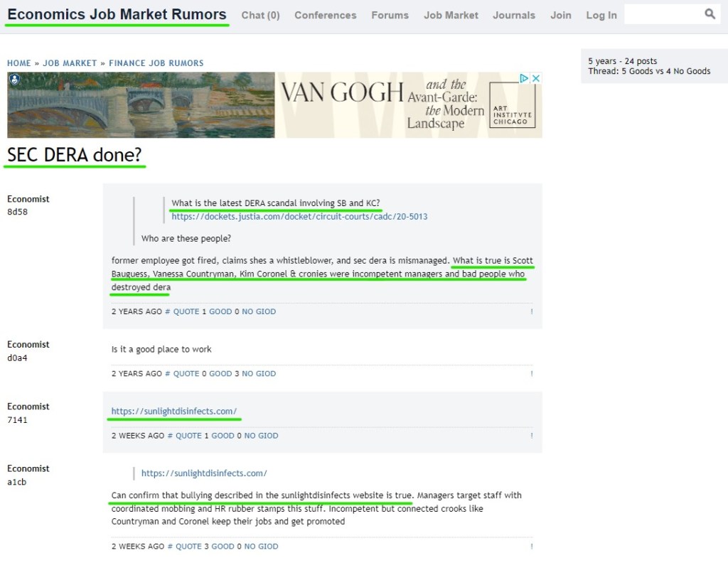 Vanessa Countryman, then DERA Chief Counsel, read in my Whistleblower statement of the pages of critical posts about DERA and its management, including herself, on the website Economic Job Rumors (XJMR). One example confirms DERA’s “bullying” and “coordinated mobbing” and correctly predicts: “…incompetent but connected crooks like Countryman [since promoted to SEC Secretary] and Coronel [since promoted to Assistant Director for Regional Operations] keep their jobs and get promoted.”