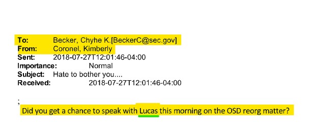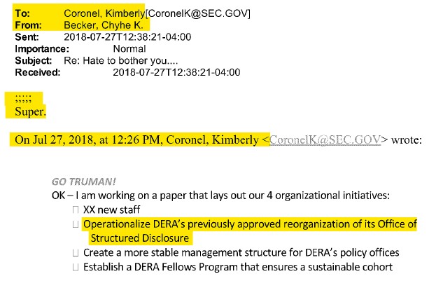 At 12:26 pm to Chyhe Becker, stating that she (Coronel) was working on a paper to “operationalize DERA’s previously approved reorganization of its Office of Structured Disclosure”. Minutes later, Becker replies “;;;;; Super.”