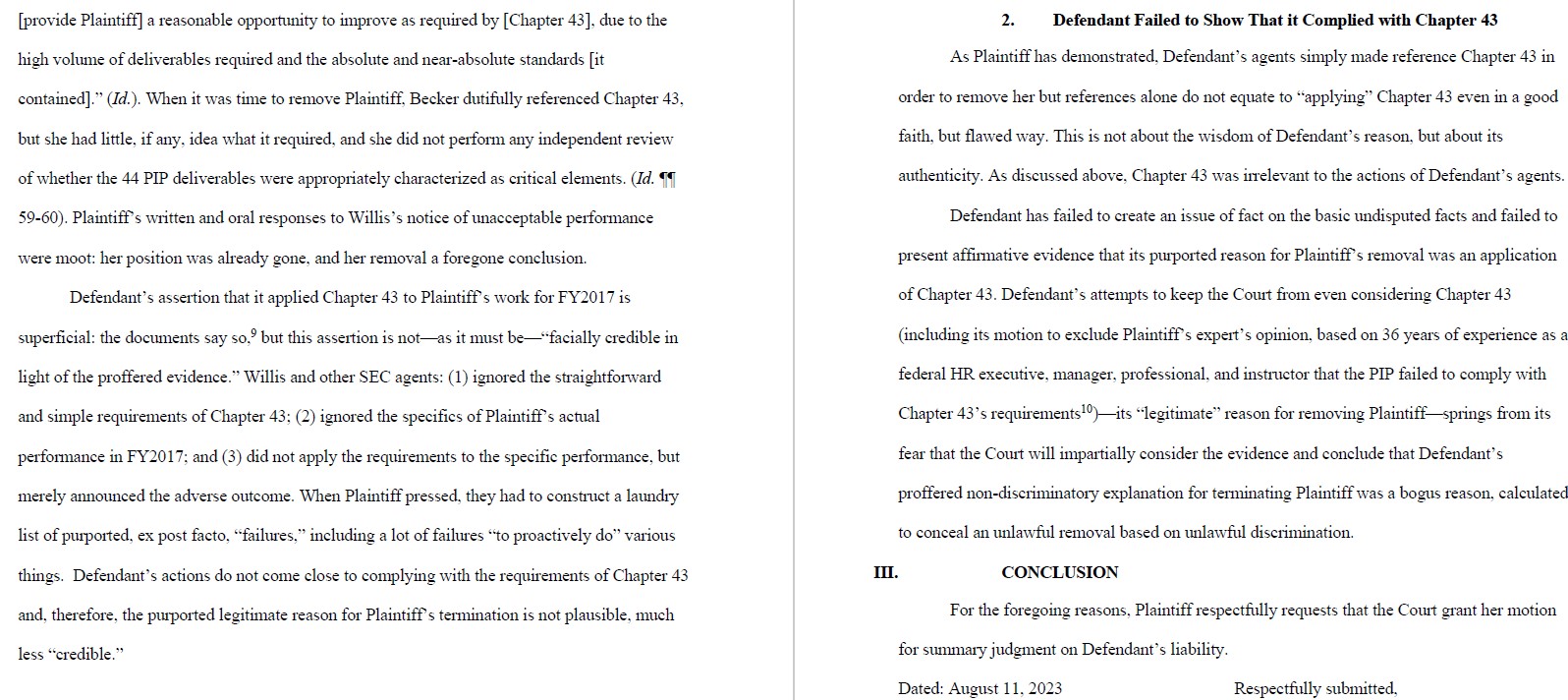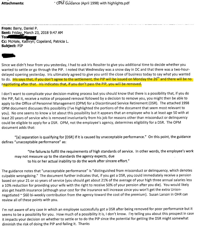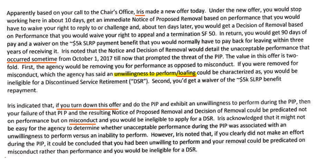 “On April 5, 2018, less than halfway through my Performance Improvement Plan, Willis sent me an email threatening my federal employment by stating that I had already failed the PIP. My attorney reported this in a letter to Iris Rossiter in the Office of General Counsel. stating that Willis’ email evidenced the pretextual nature of the PIP and its administration by Willis, and his eagerness to move on with my predetermined outcome. My attorney discussed how Willis’ email also evidenced that the PIP was crafted by OGC and DERA to ensure my failure and remove me from federal employment, rather than provide me with the right to a meaningful ‘opportunity to improve’, and to receive assistance in doing so (notwithstanding that the performance deficiencies were fabricated by the management officials as a predicate to giving me the PIP in the first place.)”