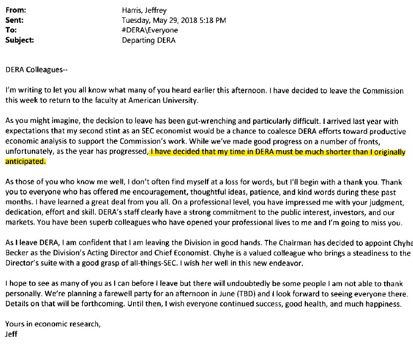 Becker was given another, albeit temporary, promotion on May 31, 2018. Three weeks after my Whistleblower statement she was appointed to Acting DERA Division Director and SEC Chief Economist, replacing former DERA Division Director and SEC Chief Economist Jeffrey H. Harris. Harris resigned suddenly after my Whistleblower statement and service of my formal EEO Complaint less than a week later. Harris was impotent, making a getaway, never following-up on our January 31, 2018 meeting when I presented him with the disturbing Union email and evidence of his subordinate Bauguess’ plots.