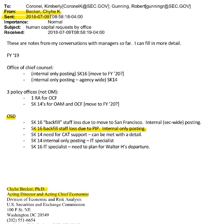Forward to July 9, 2018, Becker emailed DERA’s Managing Executive, Kim Coronel, with the subject “human capital requests”, noting an “SK-16 backfill staff loss due to PIP, internal only posting” in OSD. No one had yet said anything to me about my PIP status, nor had I received my “Notice of Proposed Removal”; those came later, on July 30 (National Whistleblower Day 2018, btw). Two months later, Chyhe Becker would be the responsible “Deciding Official” on my termination. Her sham, so-called “Decision on [my] Proposed Removal” arrived in my inbox on September 18, 2018.