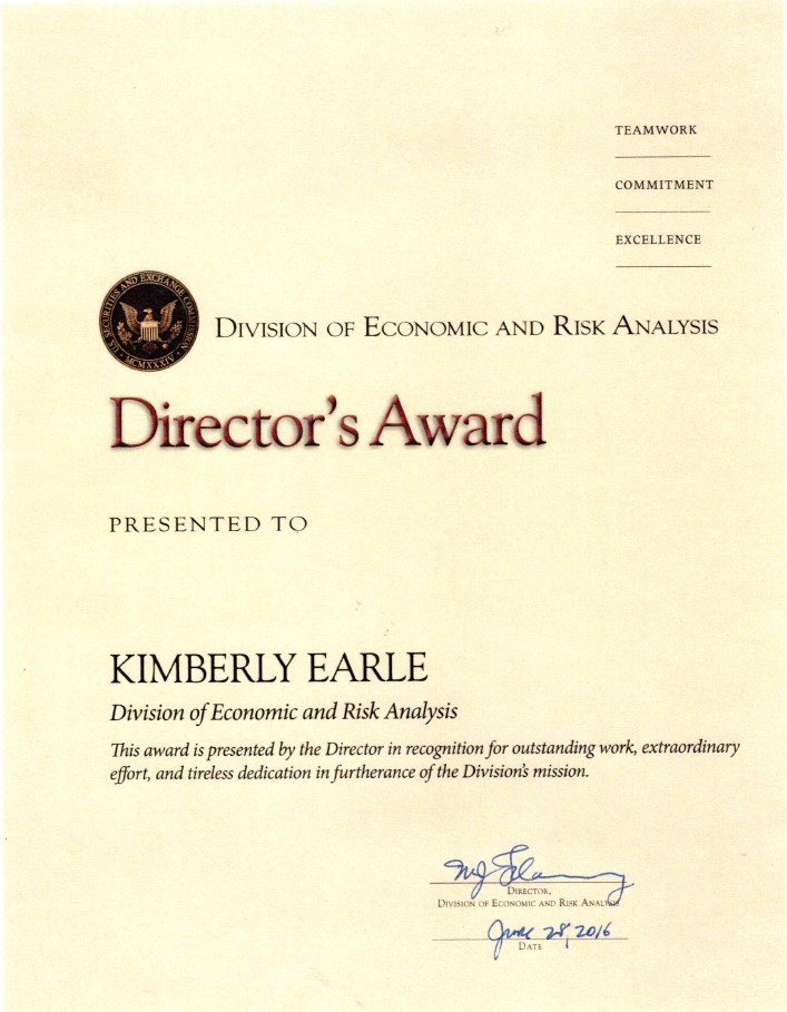 Since onboarding in mid-2015, Mr. Willis proposed my work for several SEC awards: I received a DERA Director’s Award in June 2016, and he nominated me for two SEC Honorary Awards in March 2017. Both Mr. Bauguess and Mr. Willis, in preceding years’ performance evaluations, praised my work.