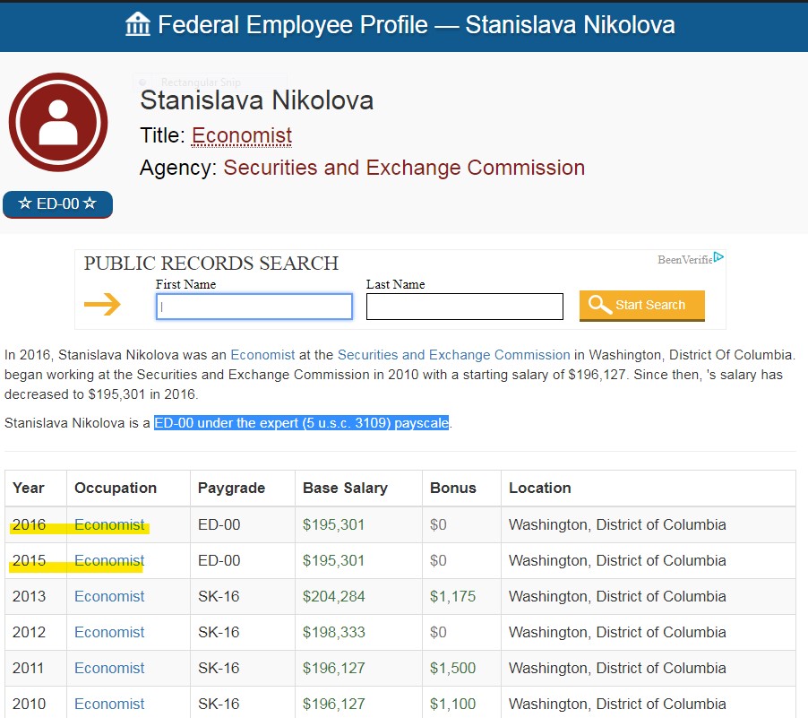 Could Stanislava Nikolova work full-time for the SEC in Washington, DC while also a professor at the University of Nebraska? Why was she paid for two years at her former SEC salary? Federal law specifies that a consultant may not receive greater than GS15, step 10 pay: $132,122.00 in 2015. Ms. Nikolova was paid +$60,000 more for two years. What was the consultant work product? While being paid by the SEC in September 2016, Ms. Nikolova did not attend a DERA ‘brownbag’ lunch where a paper she co-authored on the insurance industry was presented. More questions than answers, and more taxpayers dollars spent: for what?