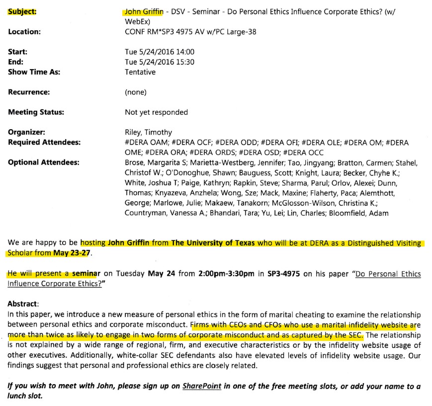 In 2016, Mr. Bauguess was the Deputy Director of DERA and Deputy SEC Chief Economist. Mr. Griffin was the Centennial Chair in Finance at the McCombs School of Business, University of Texas, Austin, as well as President of Integra FEC. Mr. Griffin was invited to the SEC in May 2016 as one of just five Distinguished Visiting Scholars, including a presentation of his paper “Do Personal Ethics Influence Corporate Ethics?“, examining white-collar SEC defendants and infidelity.